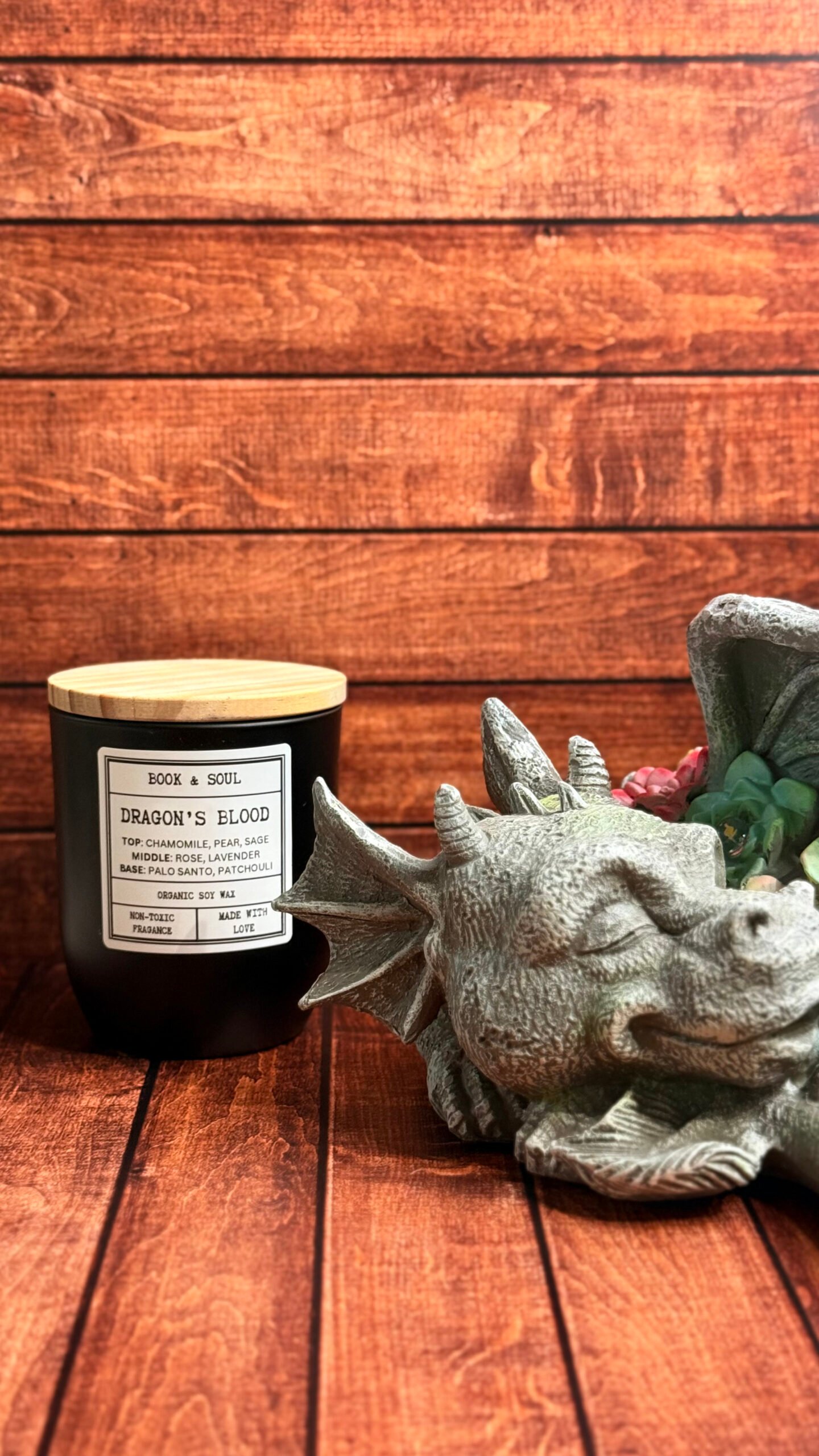 Step into a realm where magic lingers in the air and dragons guard ancient secrets. This is a fantasy inspired soy candle that weaves together calming chamomile and crisp pear with the grounding touch of sage. A heart of blooming rose and lavender softens into the sacred smoke of palo santo, anchored by deep, earthy patchouli. This enchanting blend creates an atmosphere of balance, at once soothing and powerful, as if you were resting by the fire of a dragon’s breath, safe within its protection.